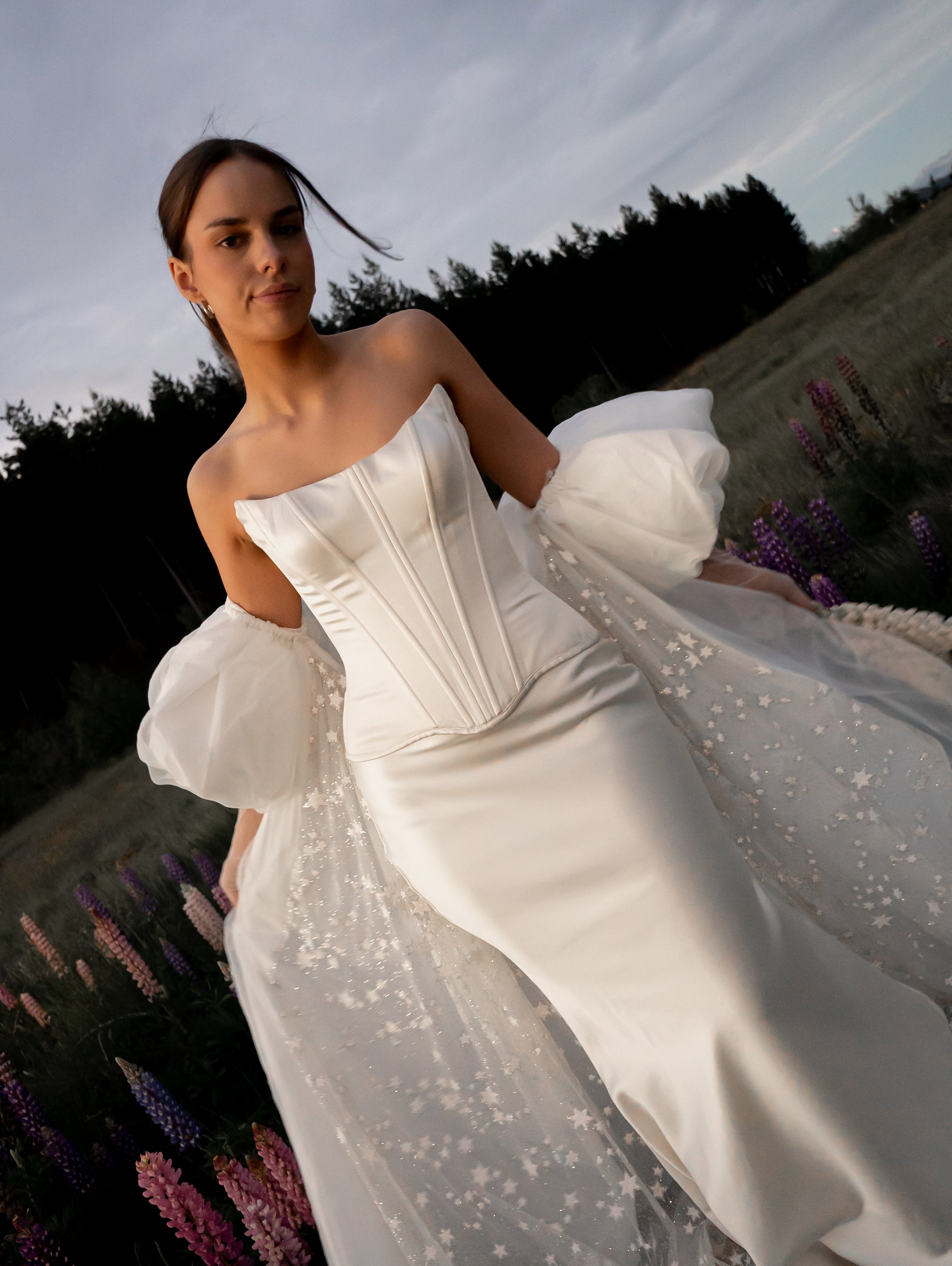 The true magic of the Aura cape lies in its ethereal train, where glowing stars are hidden inside. Imagine spreading your arms to embrace your love, and the stars wrap around you both, casting a romantic, celestial glow. The puff sleeves, inspired by the drama of the '80s, add a bold and sophisticated flair, making this cape the ideal choice for the stylish bride who dares to stand out.