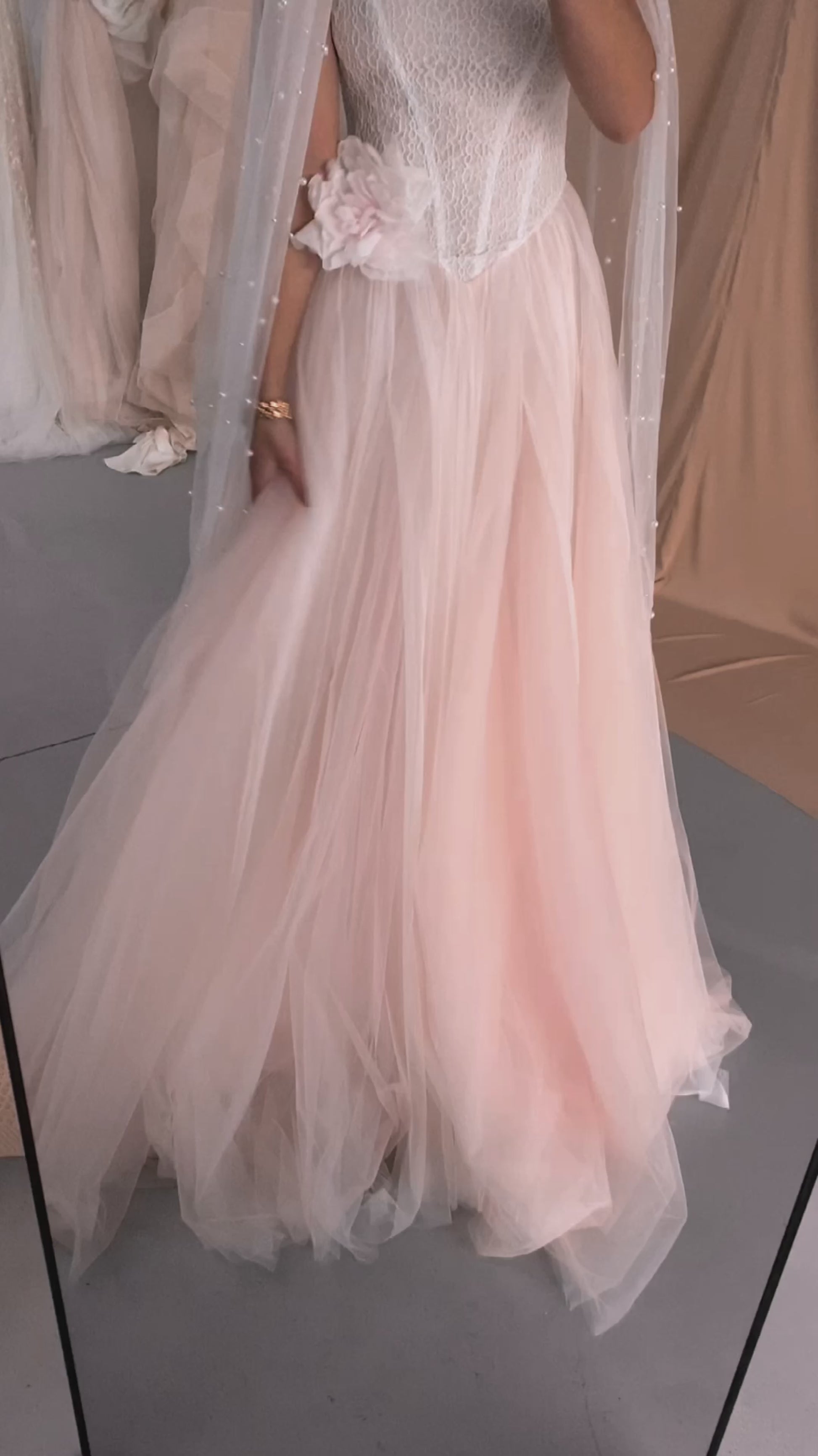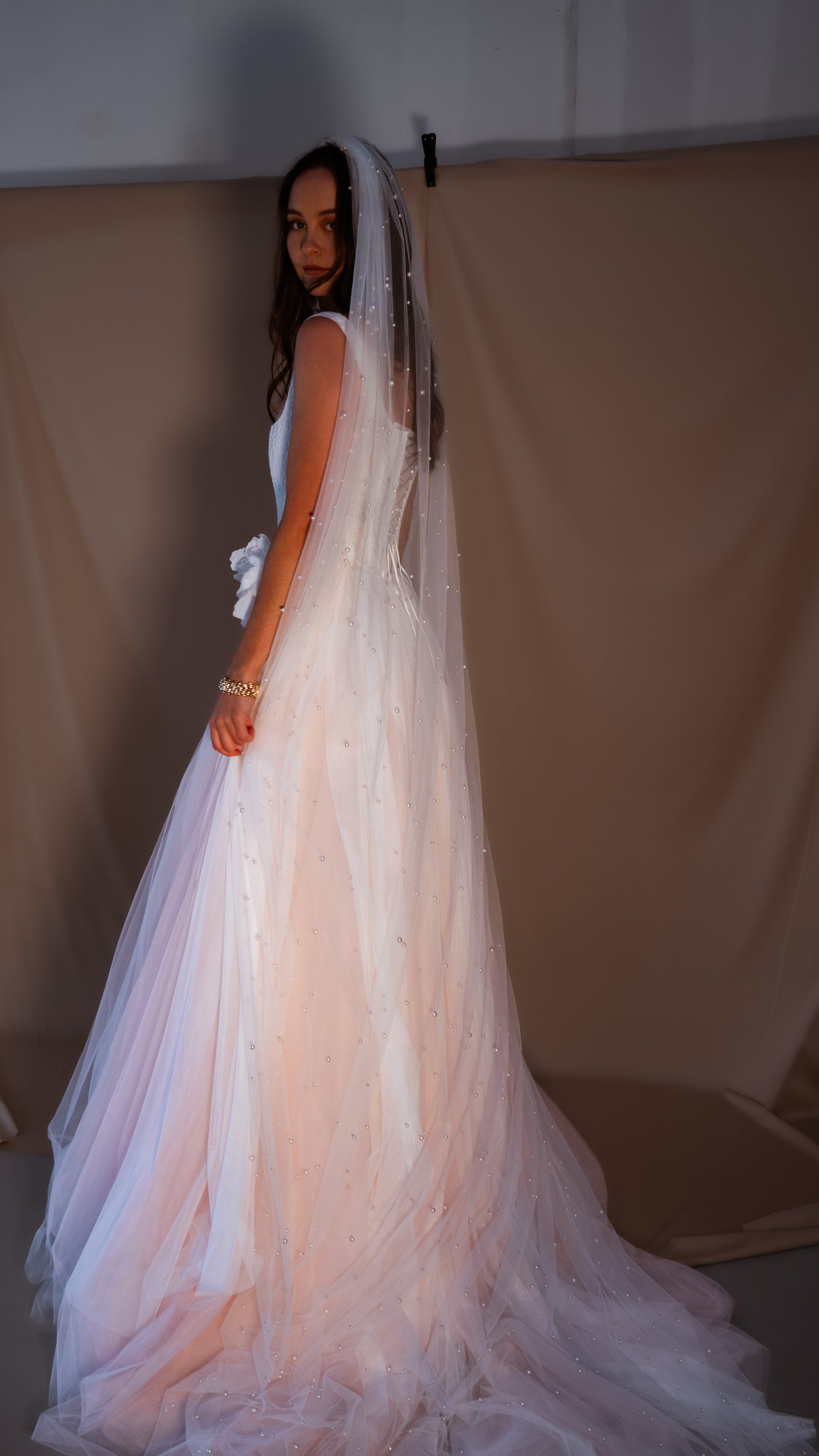Let us know if you'd like a veil to complement your gown. Matching the veil shade to your dress is crucial. We'll make sure to use tulle in the same tone as your gown to ensure a seamless and coordinated look.