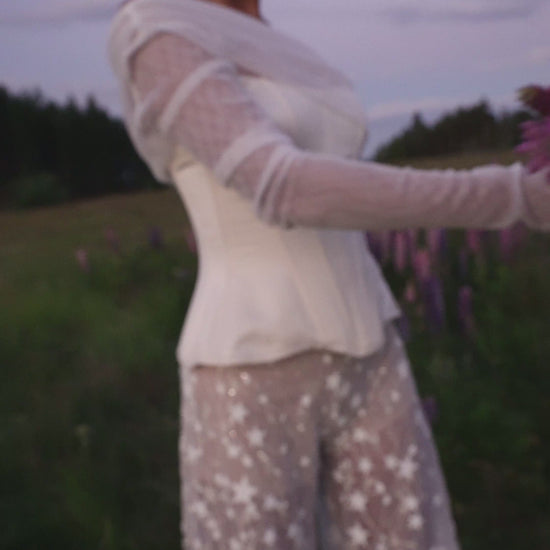 Made from ultra-soft ivory elastic tulle, they gently wrap around the bust and upper arms, creating light volume and movement without structure or stiffness.