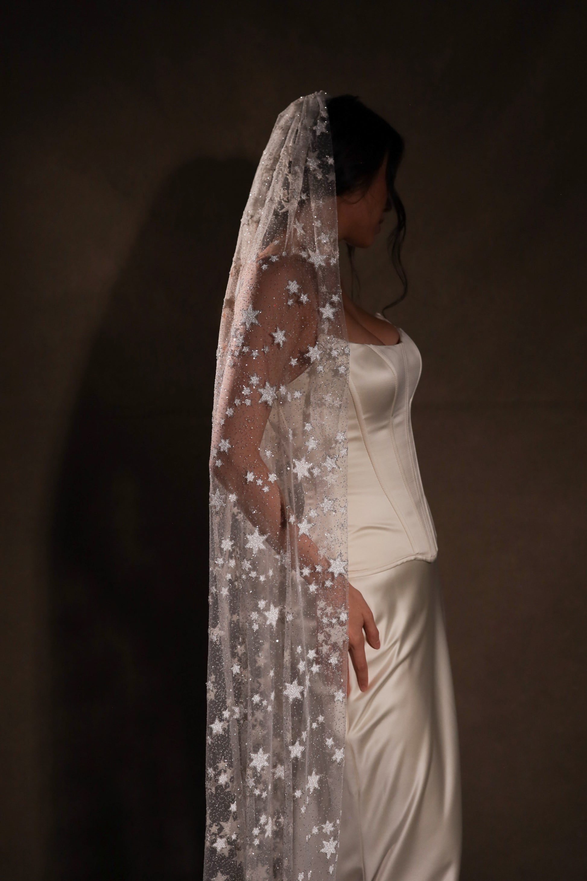 Discover the magic of our signature starry veil, a boho wedding veil adorned with stars that brings a celestial dream to life. Crafted with meticulous attention to detail, this veil features a sprinkle of heavenly glow that sets it apart. But what makes these stars shine like genuine astral bodies? The secret is our exclusive use of petite reflective beads that catch the light, inspired by the same technology used on airport runways to guide planes safely to land.